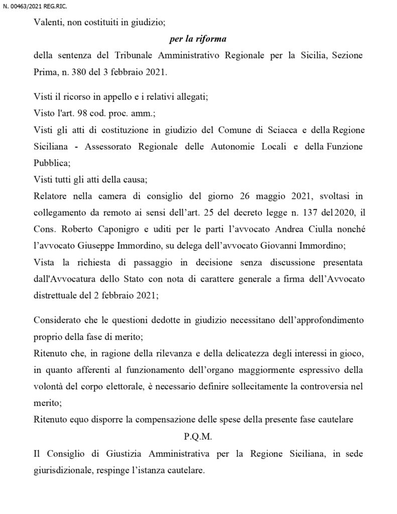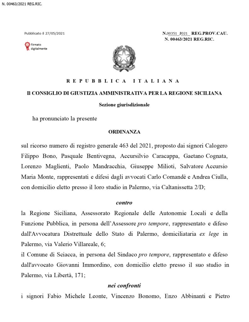 Il Consiglio di Giustizia Amministrativa si e’ espresso su ricorso presentato per la riforma della sentenza del Tribunale Amministrativo Regionale per la Sicilia, ricorso  proposto dagli ex consiglieri comunali Calogero Filippo Bono, Pasquale Bentivegna, Accursilvio Caracappa, Gaetano Cognata, Lorenzo Maglienti, Paolo Mandracchia, Giuseppe Milioti, Salvatore Accursio Maria Monte, rappresentati e difesi dagli avvocati Carlo Comandè e Andrea Ciulla, contro la Regione Siciliana, Assessorato Regionale delle Autonomie Locali e della