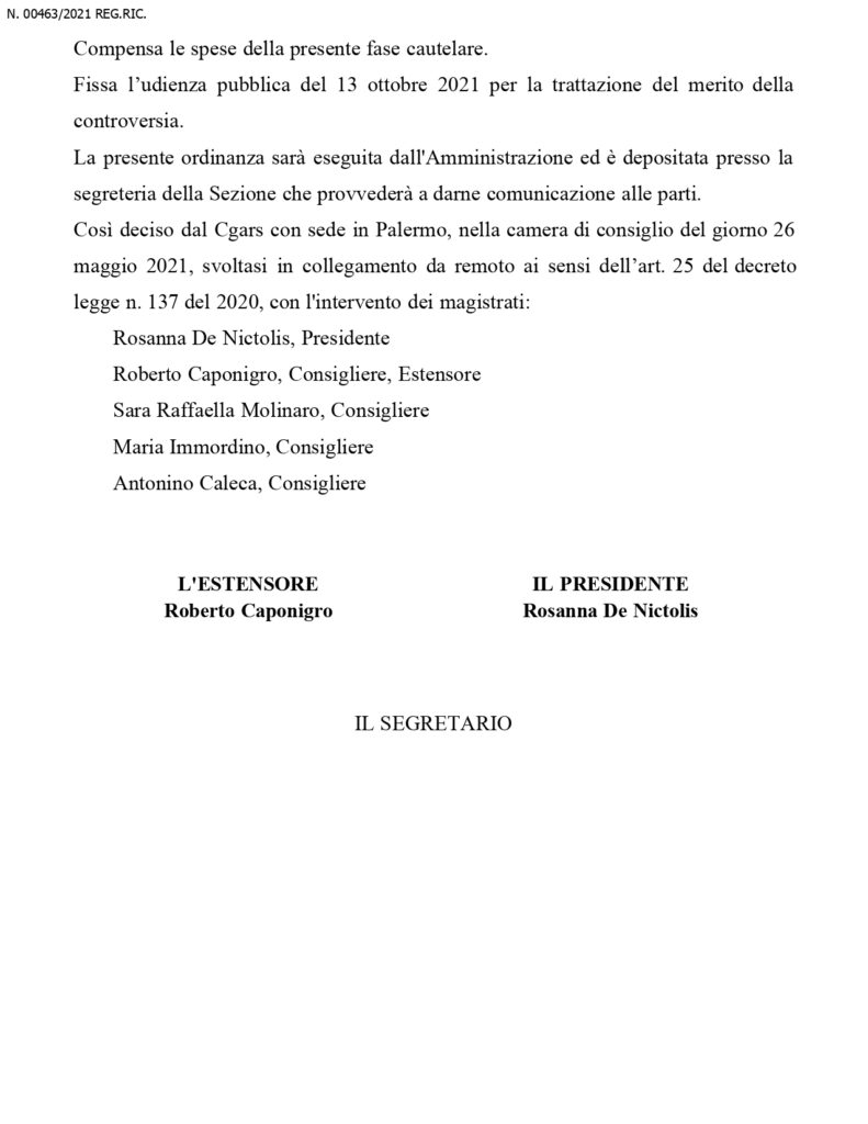 Respinta la sospensiva degli ex consiglieri comunali, il Cga entrera’ nel merito con udienza fissata il tredici ottobre prossimo