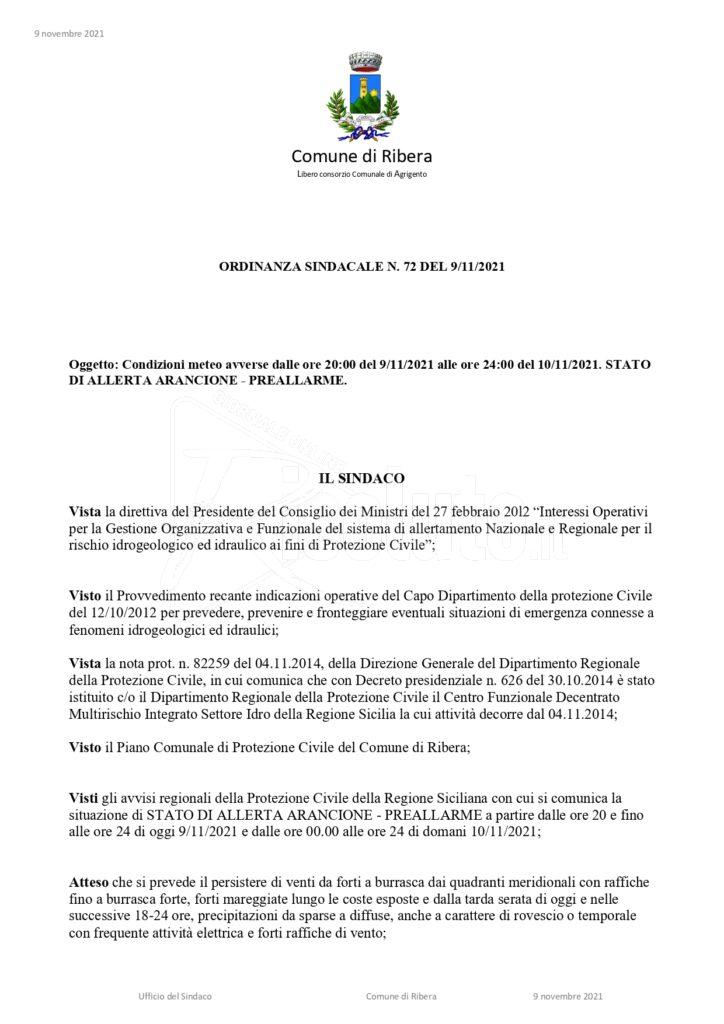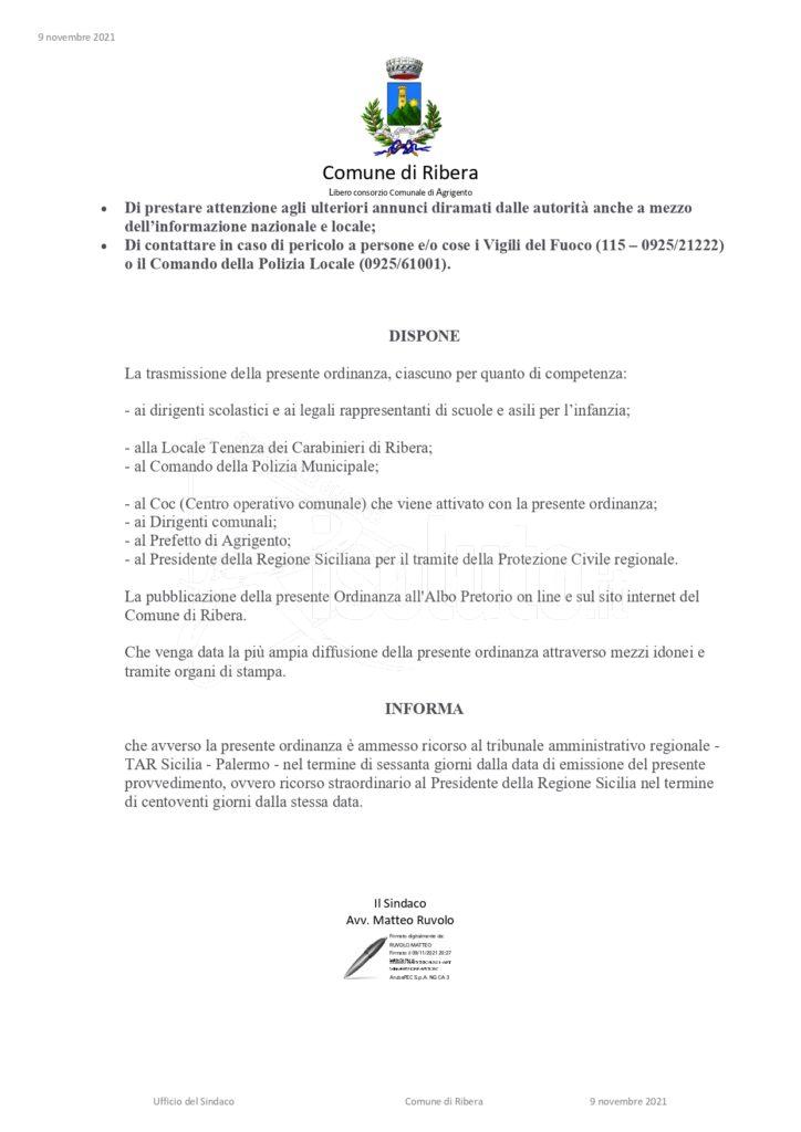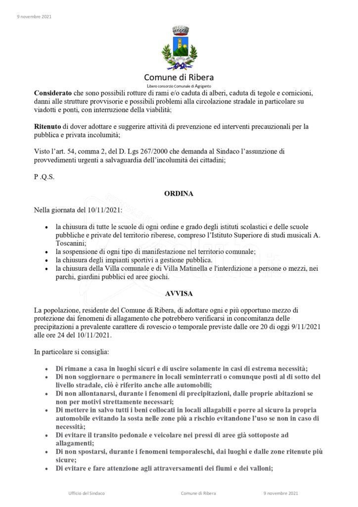 Ha firmato l’ordinanza di chiusura delle scuole per domani, mercoledì 10 novembre, anche il sindaco di Ribera, Matteo Ruvolo dopo aver ricevuto gli ultimi aggiornamenti ed essersi confrontato con i colleghi sindaci del comprensorio.