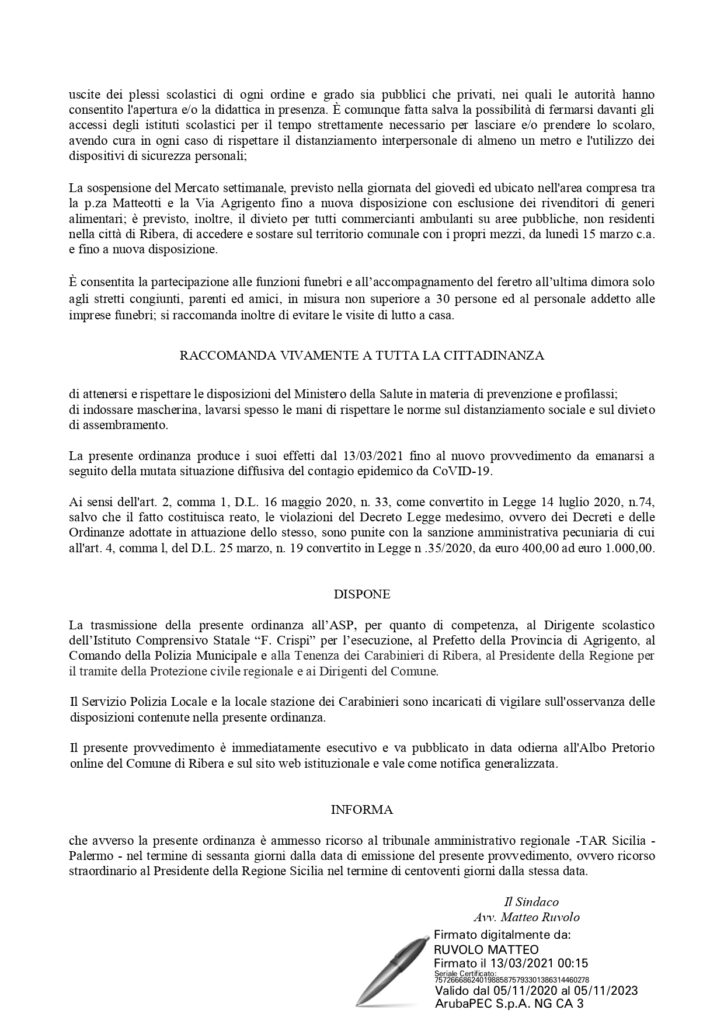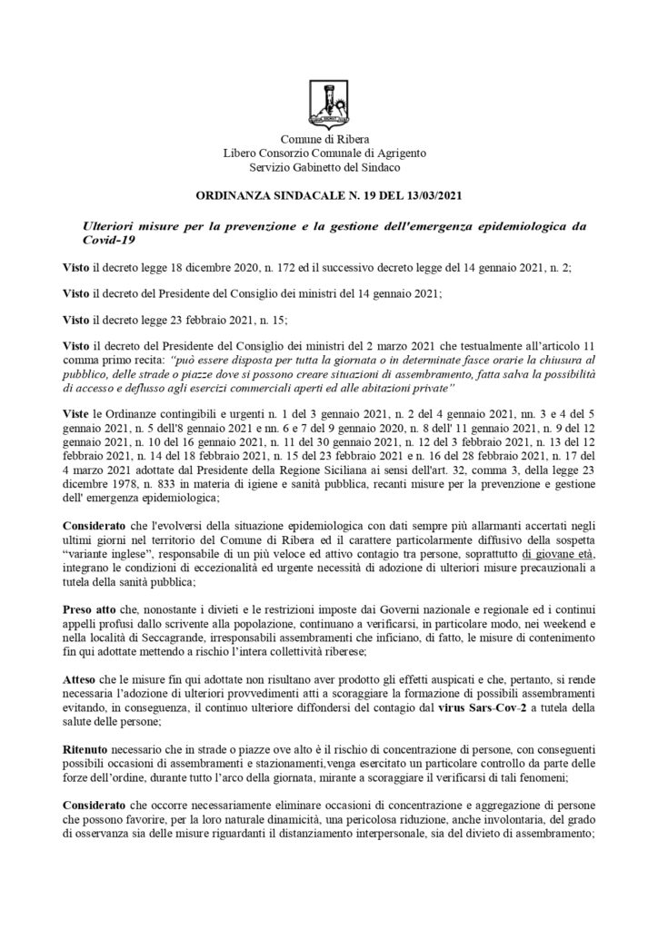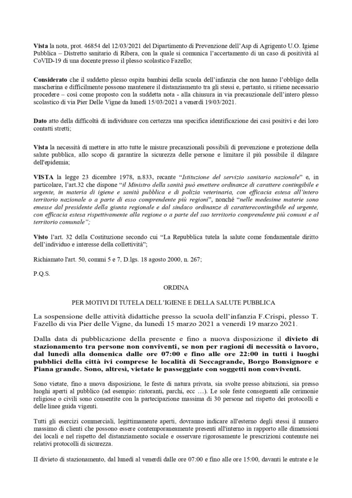 Nuova ordinanza sindacale in vigore da oggi anche a Ribera. Il sindaco Matteo Ruvolo si dice molto preoccupato dall’aumento dei ricoveri ospedalieri e dal numero dei suoi concittadini risultati positivi al COVID-19 e pertanto ha emanato questa mattina un nuovo provvedimento di contenimento che contiene le seguenti misure: la Sospensione delle attività didattiche presso la scuola dell’infanzia F.Crispi, plesso T. Fazello di via Pier delle Vigne, da lunedì 15 marzo 2021 a venerdì 19 marzo 2021; il divieto di stazionamento, dal lunedì al venerdì dalle ore 07:00 e fino alle ore 15:00, davanti le entrate e le uscite dei plessi scolastici di ogni ordine e grado sia pubblici che privati, nei quali le autorità hanno consentito l’apertura e/o la didattica in presenza. È comunque permesso fermarsi davanti gli accessi degli istituti scolastici per il tempo strettamente necessario per lasciare e/o prendere lo scolaro, avendo cura in ogni caso di rispettare il distanziamento interpersonale di almeno un metro e l’utilizzo dei dispositivi di sicurezza personali;