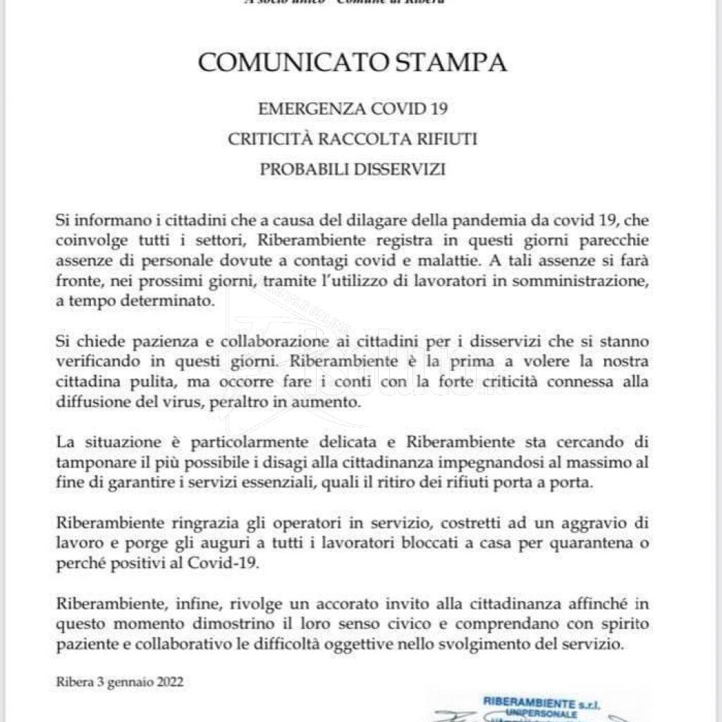 “Riberamente – si legge in una nota stampa – ringrazia gli operatori in servizio, costretti ad un aggravio di lavoro e porge gli auguri a tutti i lavoratori bloccati a casa per quarantena o perché positivi al Covid 19. Riberambiente, infine, rivolge un accorato invito alla cittadinanza affinché in questo momento dimostrano il loro senso civico e comprendano con spirito paziente e collaborativo le difficoltà oggettive nello svolgimento del servizio”.