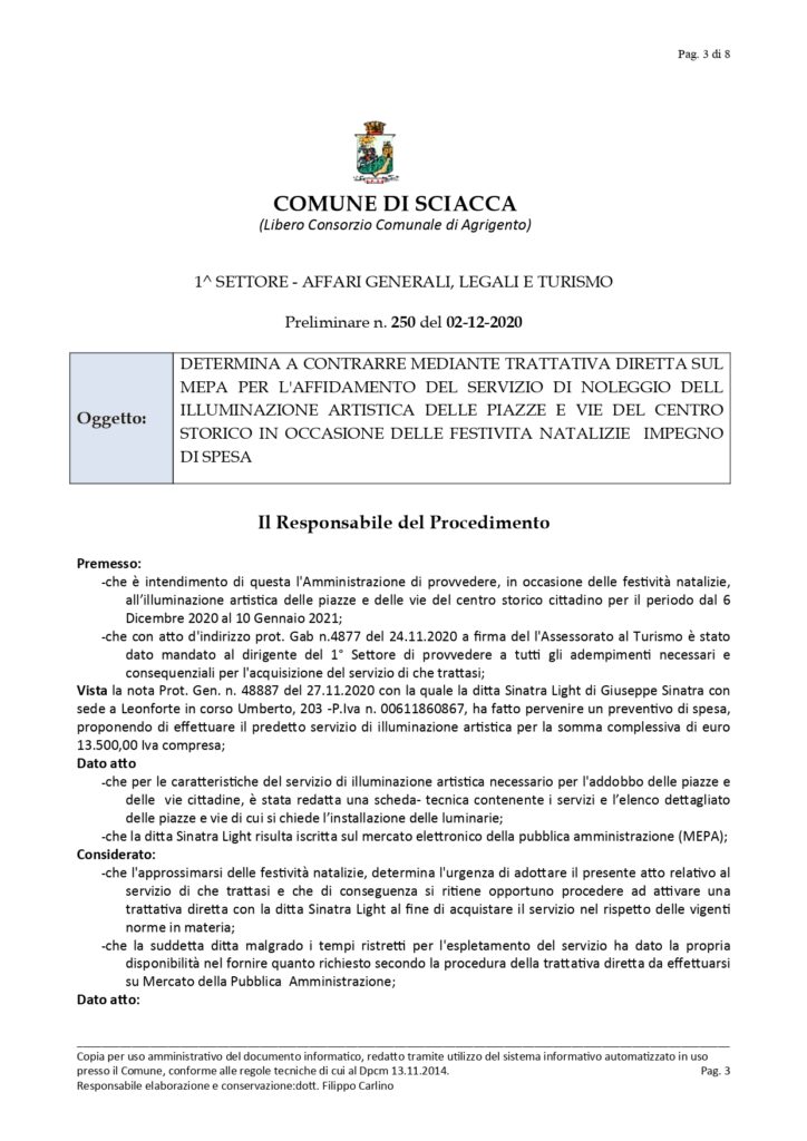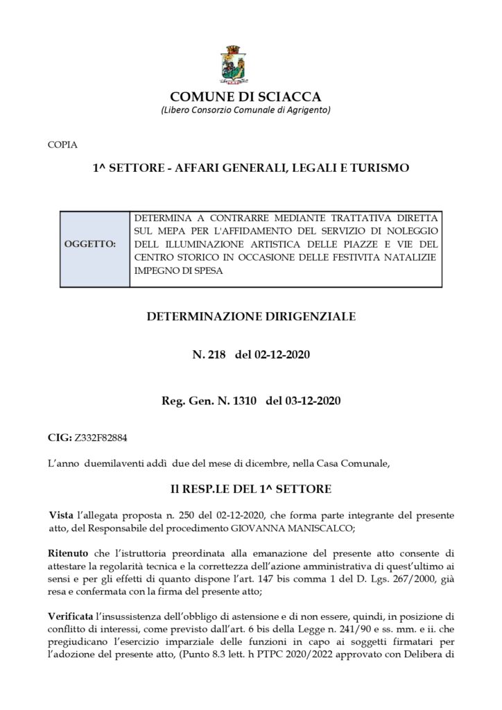E’ stata pubblicata sull’albo pretorio del Comune di Sciacca la determina per l’affidamento dell’illuminazione cittadina in occasione del Natale.