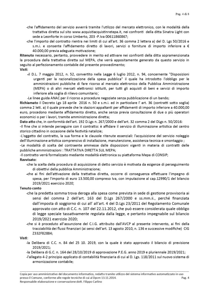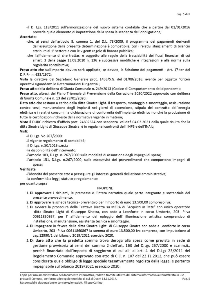 Sara’ la ditta Sinatra Light a realizzare l’illuminazione artistica per la somma di tredici mila euro iva inclusa. La ditta di Leonforte e’ stata individuata tramite piattaforma Mepa.