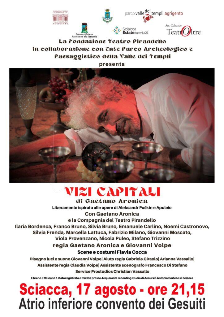 Stasera a Sciacca andra’ in scena lo spettacolo “Vizi Capitali” di Gaetano Aronica con la compagnia del teatro Pirandello di Agrigento. Uno degli spettacoli di spessore del cartellone di Sciacca Estate 2021.