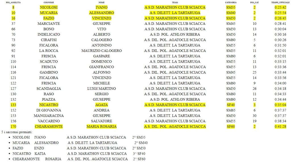 Tra i 200 runners che si sono misurati su un arduo percorso, tra salite e discese di 6,8 km, 23 erano i saccensi, appartenenti alle tre associazioni di Sciacca, Tartaruga, Agatocle e Marathon.