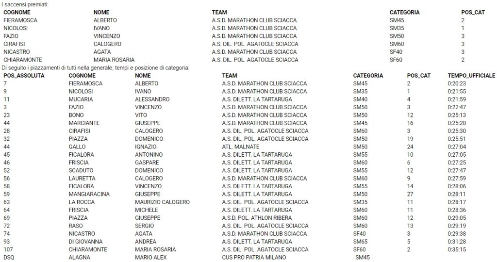 Di seguito i saccensi premiati e i piazzamenti generali di tutti i podisti di Sciacca che hanno gareggiato.